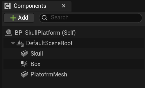 To begin to code my level I first created two blueprints for the 'skull door' and skull key' and created a collision box for the 'skull key'. After doing that I created a 'Platform mesh' to be able to pick up the skull when interacted ; by adding the code with the red boxes I was able to implemented a system where when the player presses 'E' the skull mesh will disappear and be saved until they interact with the door. To make sure that worked I also implemented a print string showing it interacted. To make sure the key disappeared I added the last code to make sure it will disappear and add to the players key count by one.